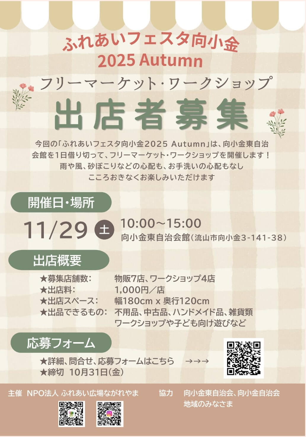 今回の「ふれあいフェスタ向小金2025 Autumn」は、向小金東自治会館を1日借り切って、フリーマーケット・ワークショップを開催することになりました! 新しい試みです。雨や風、砂ぼこりなどの心配もなく、お手洗いの心配もいりません。こころお...