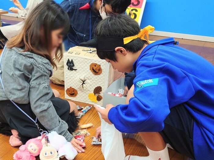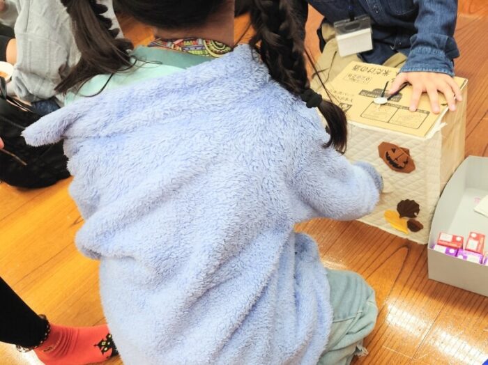今回のメインイベントは、子ども達向け「お菓子つかみ取り」ゲーム。箱の中に手を入れて、1回でつかめた分のお菓子をもらえます。