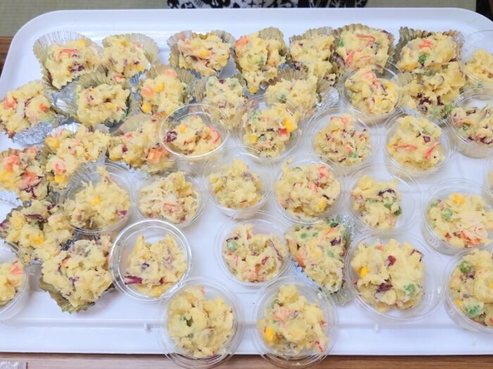 お菓子つかみ取りは中学生が全部仕切ってくれました。優しいお兄ちゃん達でした。パントリーの準備も、品物配布も中学生メインです。その他にも、ポテサラを盛り付けてくれたり、ハロウィンの旗を立ててくれたり。